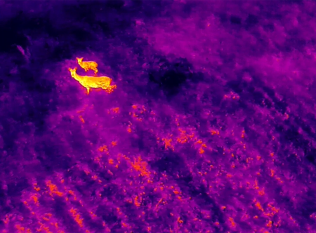 The experimental video is created from thermal imaging drone footage and developed through a field visit to a fawn rescue operation, engaging in the process as a form of artistic field research.